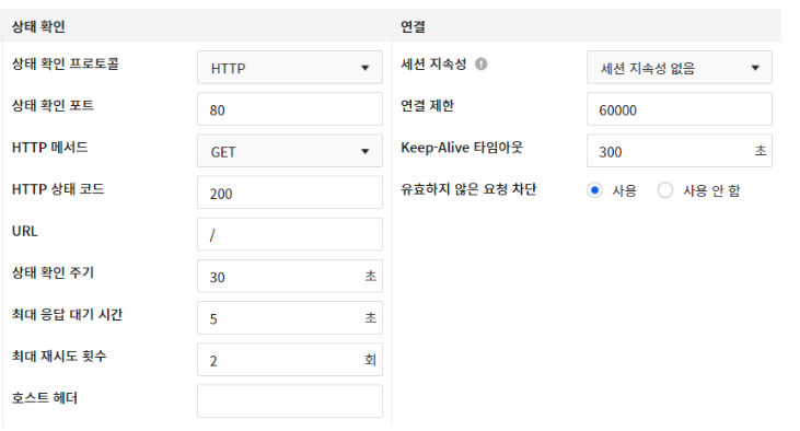 인스턴스가 정상적으로 동작하는지 알려주는 상태확인과 세션 유지를 위한 연결의 세부 규칙을 지정한다. 본 가이드는 아래와 같이 설정하였다.