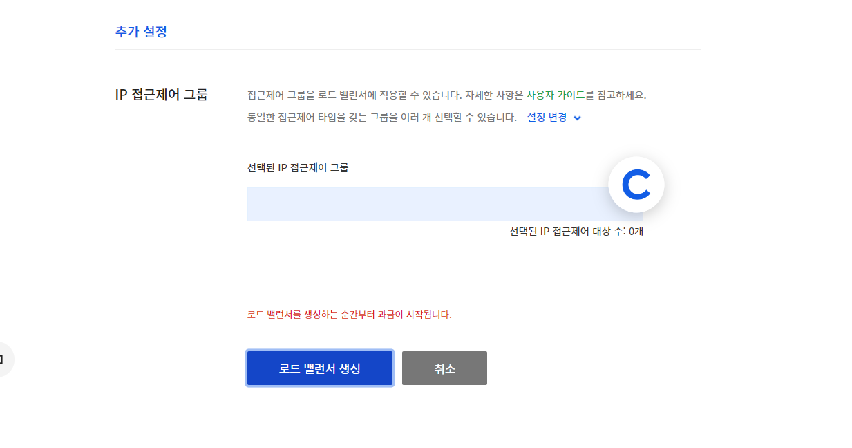 로드밸런서는 모든 IP의 접근을 허용하므로 유입되는 트래픽에 대한 제어가 필요한 경우에는 IP 접근 제어 그룹을 등록한다. 해당 항목까지 설정 후 로드 밸런서 생성 버튼을 선택해 생성을 완료한다.
