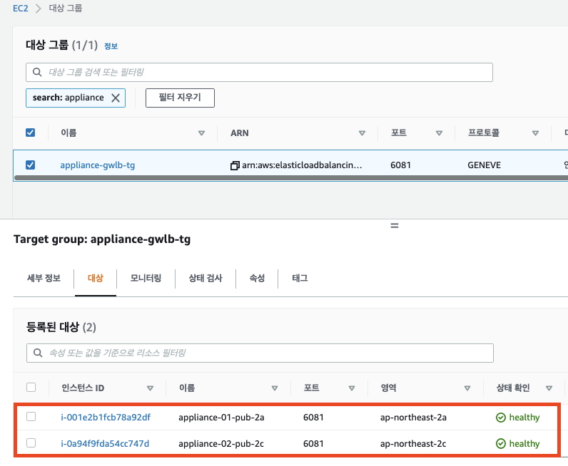 AWS 관리 콘솔 > EC2 > 로드밸런싱 > 대상 그룹 메뉴에서 appliance-gwlb-tg를 선택하여 설정된 대상이 application balancer의 ip로 설정이 되어있는지 확인합니다.