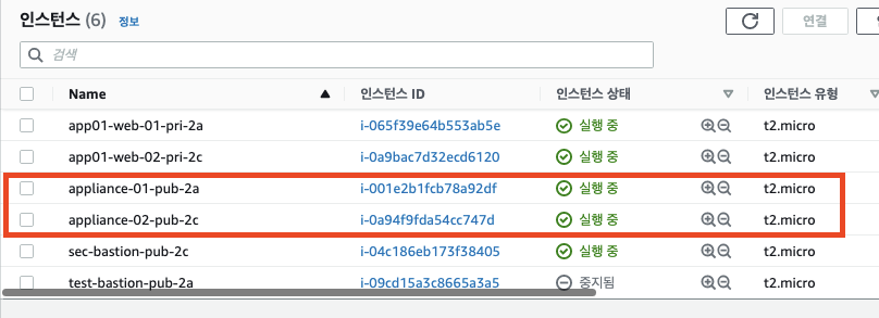 AWS 관리 콘솔 > EC2 > 인스턴스 메뉴를 선택합니다. 2대의 appliance 서버가 설치되어있는 것을 확인할 수 있습니다.