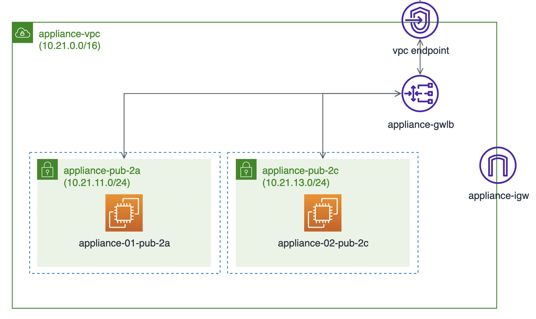 - sec-vpc의 GWLB VPC Endpoint에서 appliance-vpc의 VPC Endpoint Service로 트래픽을 전송합니다.