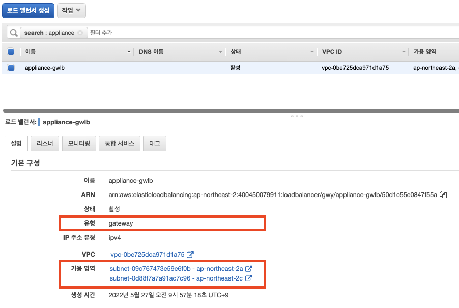 AWS 관리 콘솔 > EC2 > 로드밸런싱 > 로드밸런서 메뉴에서 appliance-gwlb를 선택하여 구성된 내용을 확인합니다.