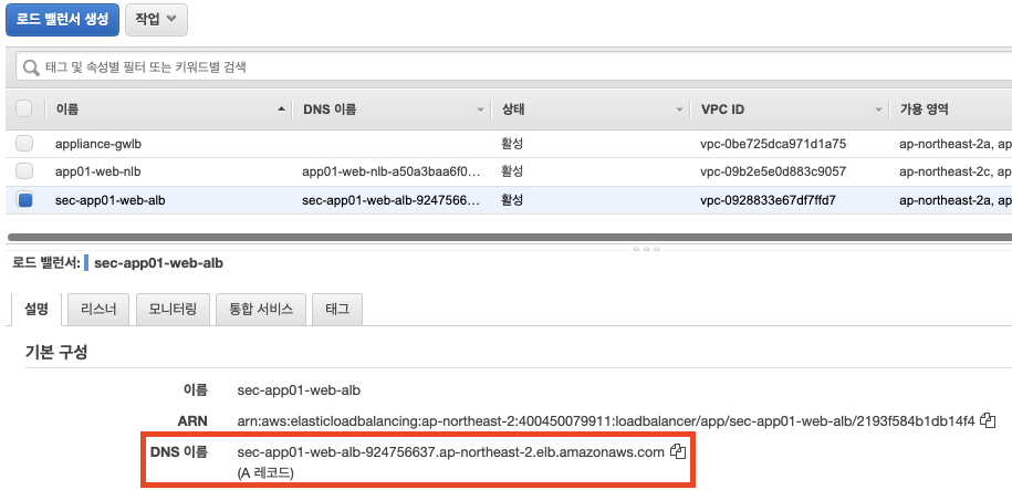 외부에 노출된 ALB DNS A 레코드를 확인하고 복사합니다.