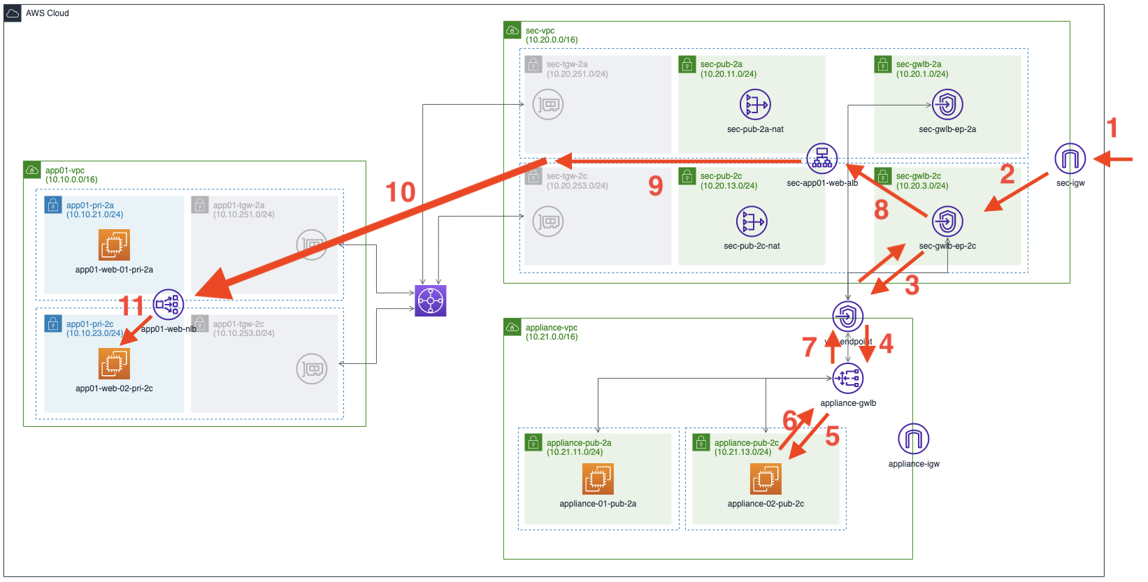 - GWLB Subnet에서 ALB(sec-app01-web-alb)로 전달합니다.