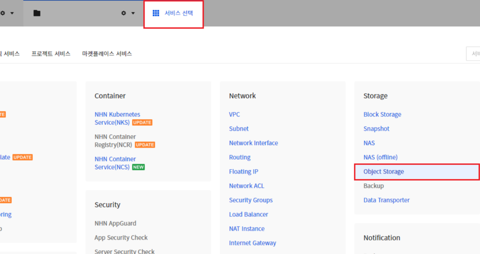 상단의 서비스 선택 버튼을 클릭 후 Object Storage를 선택해 서비스 활성화를 진행한다.