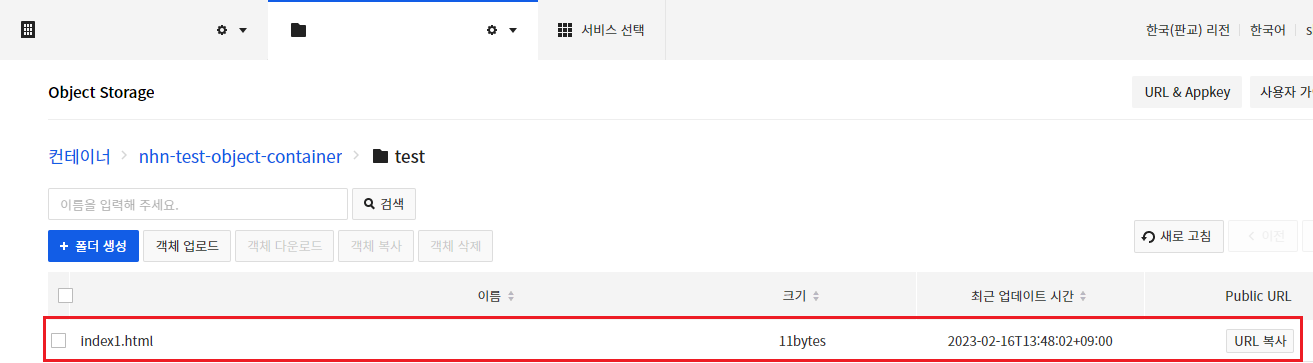 객체 업로드 버튼을 통해 미리 준비해 둔 파일을 업로드한다.