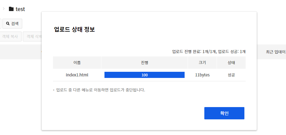 오브젝트 업로드 성공 유무는 업로드 상태 정보를 통해 제공된다.