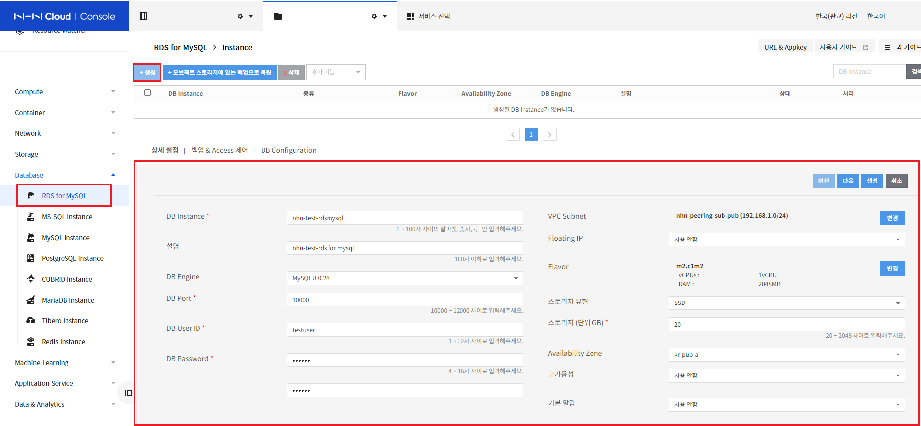 - 고가용성: 고가용성을 사용으로 선택할 경우 DB 인스턴스를 생성할 때, Master와 다른 가용성 영역에 Candidate Master가 생성되며 생성 된 Candidate Master는 DB 인스턴스 목록에서 조회되지 않습니다.