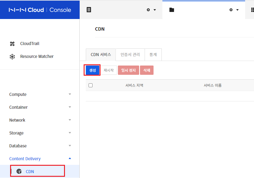 생성한 CDN 서비스는 Content Delivery > CDN 에서 조회 할 수 있다.