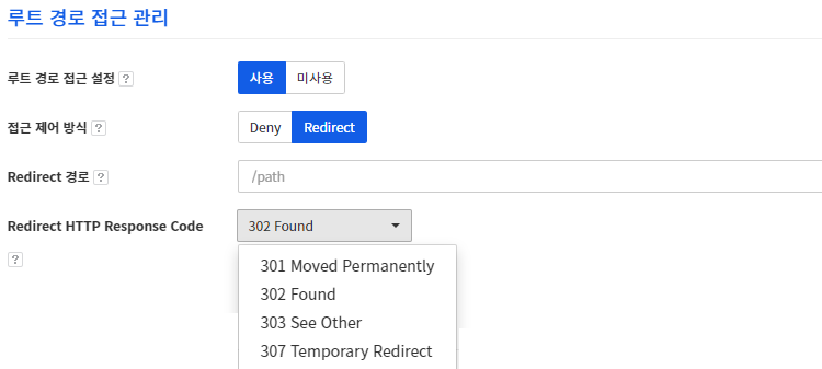 Redirect HTTP Response Code: 루트 경로에 대한 요청을 리다이렉트하고 전달할 HTTP 응답 코드를 301, 302, 303, 307 중 선택하여 설정한다.