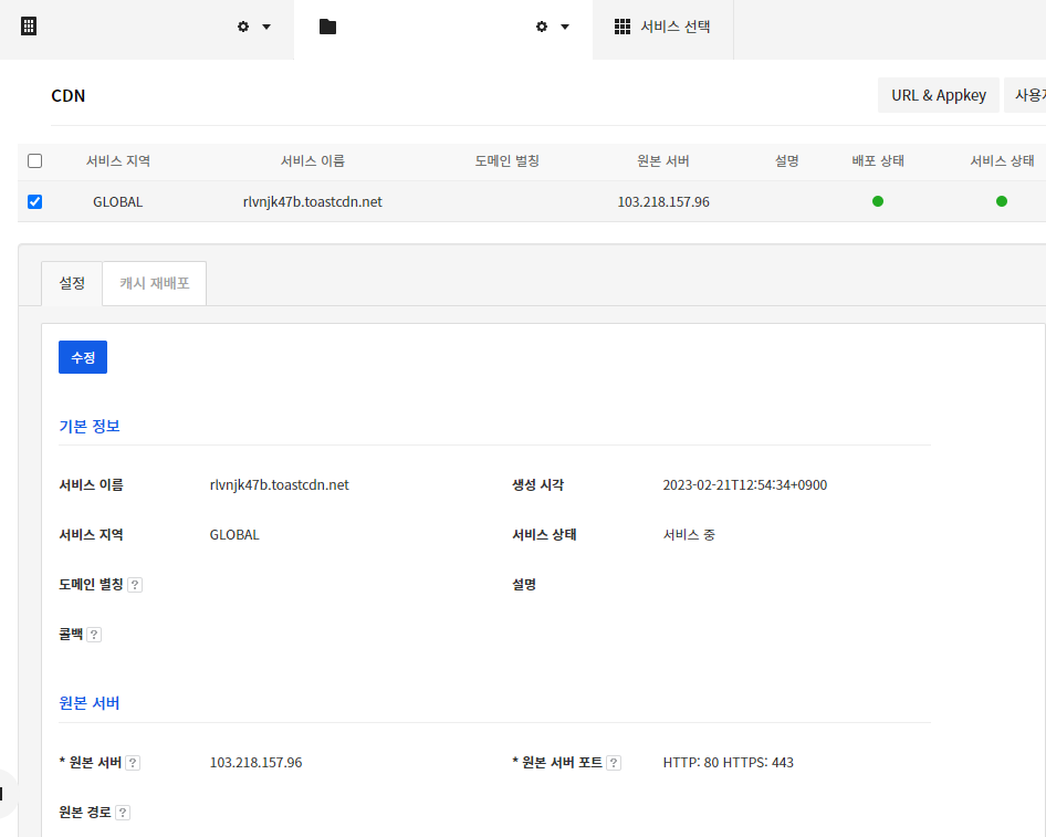 배포 상태 및 서비스 상태에 초록 불이 들어오면 생성한 CDN 서비스를 이용할 수 있다.