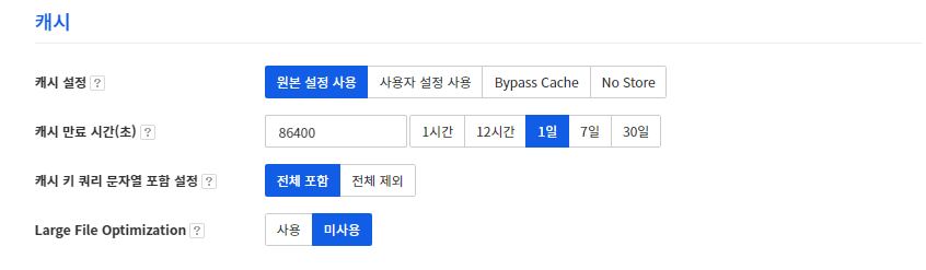 캐시 설정: 원본 설정 사용을 선택할 경우 원본 서버의 응답에서 제고한 캐시 제어 헤더를 우선 적용한다. 사용자 설정 사용을 선택할 경우 캐시 만료시간에 지정한 시간 동안 캐시된다.