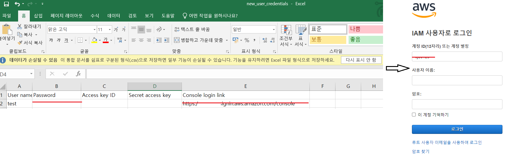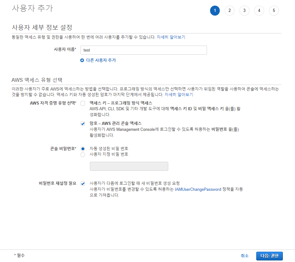 자격 증명 유형: 액세스 키 방식과 암호 방식 중 선택 가능, 콘솔 로그인 진행 시 암호 방식으로 진행