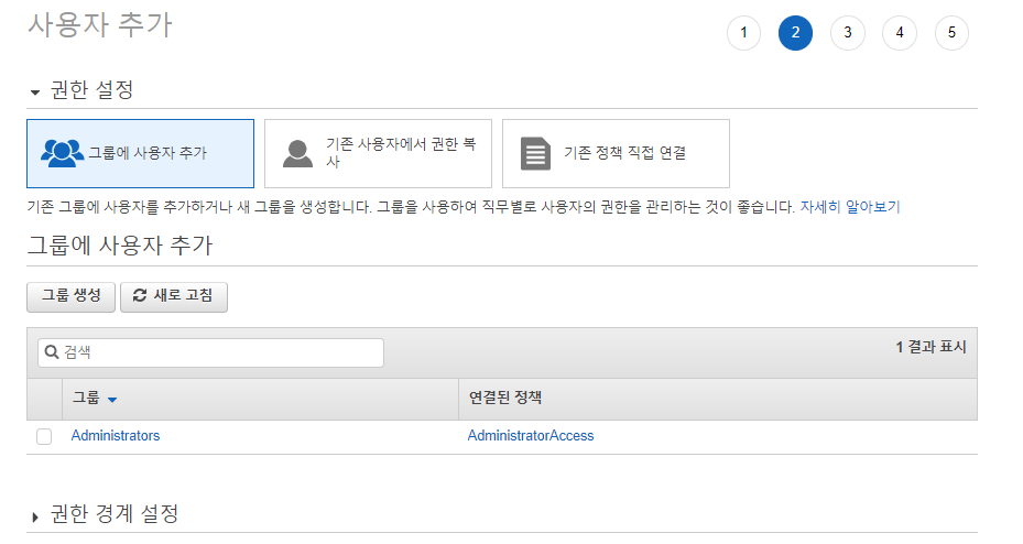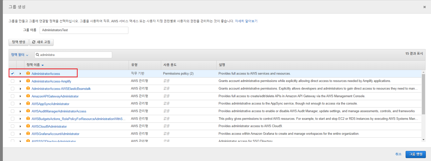 AdministratorAccess 정책 체크 후 그룹 생성 버튼 선택