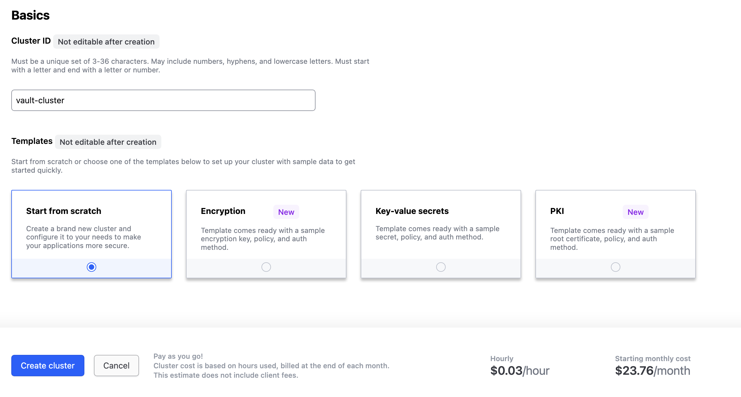 Vault tier는 Development, Cluster size는 Extra Small을 선택합니다.