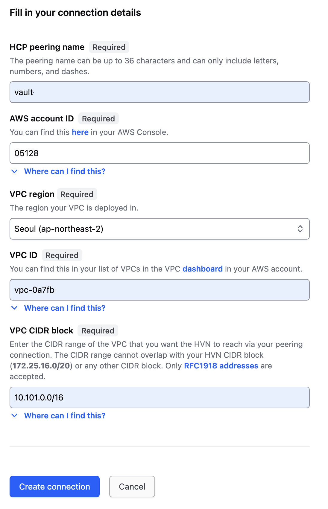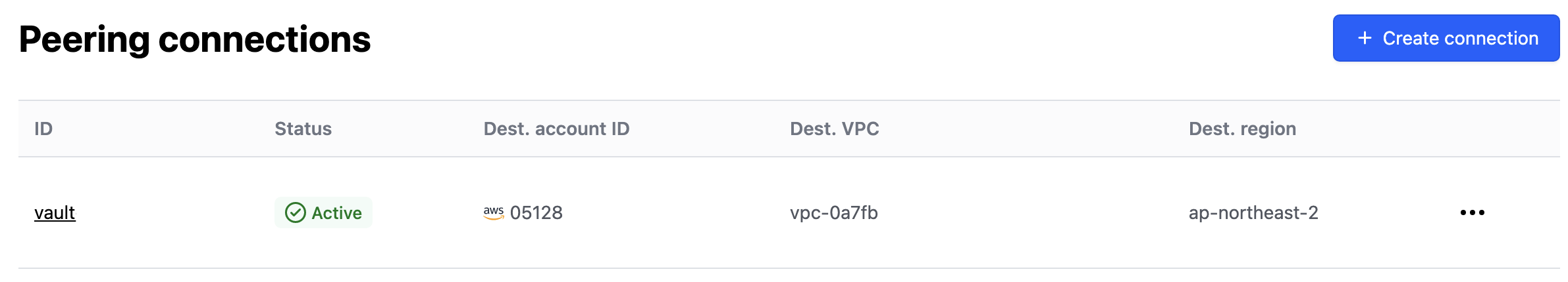 AWS Console - VPC - 피어링 연결 항목에서 vault에서 요청한 peering을 수락하면 다음과 유사합니다.