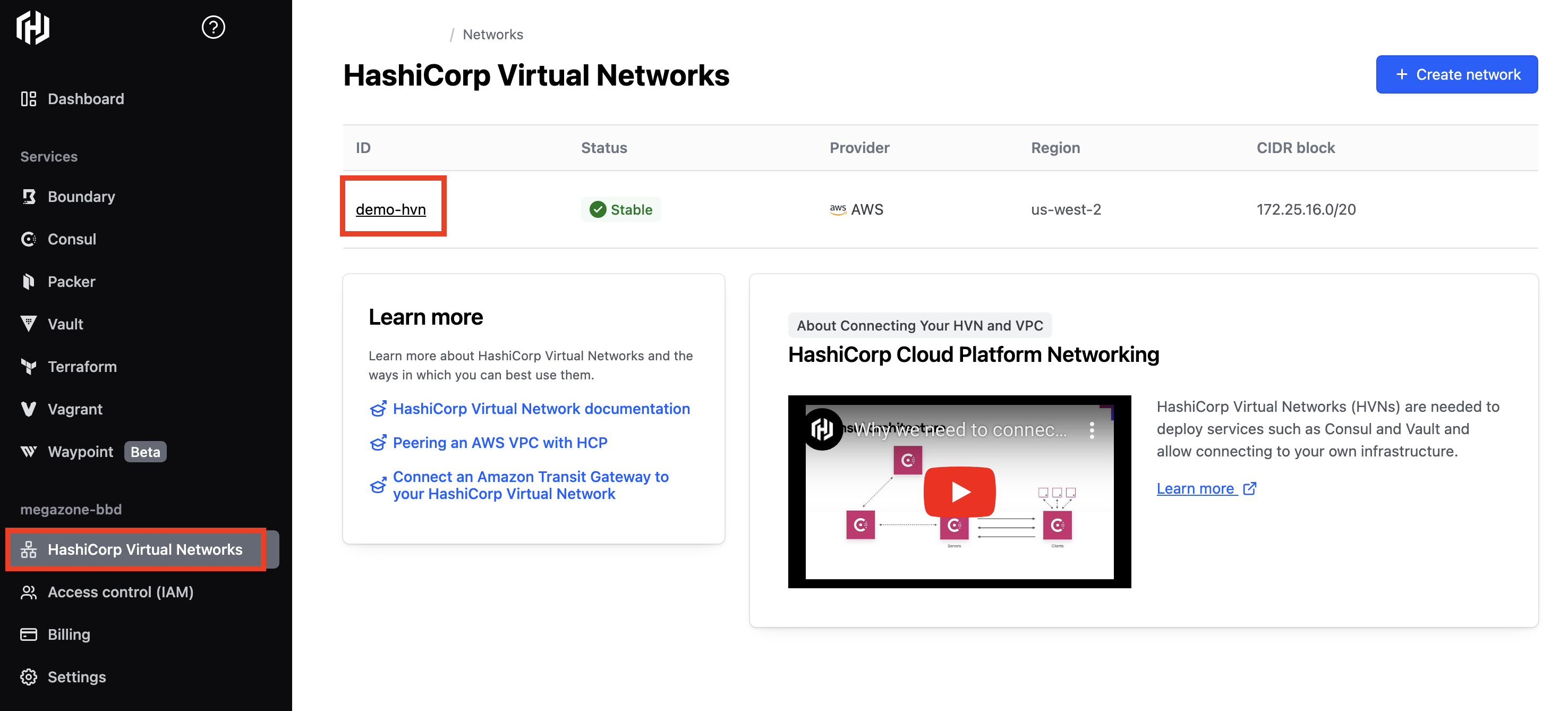 앞서 Cluster를 생성할때 Network를 기본으로 설정했다면 아래 스크린샷처럼 demo-hvn이 생성되어 있습니다. demo-hvn을 클릭하여 이동합니다.