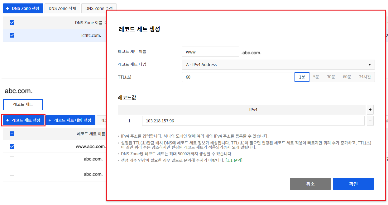 - 레코드 값: 레코드 세트 타입에 따른 값을 입력한다. 본 가이드에서는 A 타입을 설정하여 웹서버의 IP주소를 입력하여 진행한다.