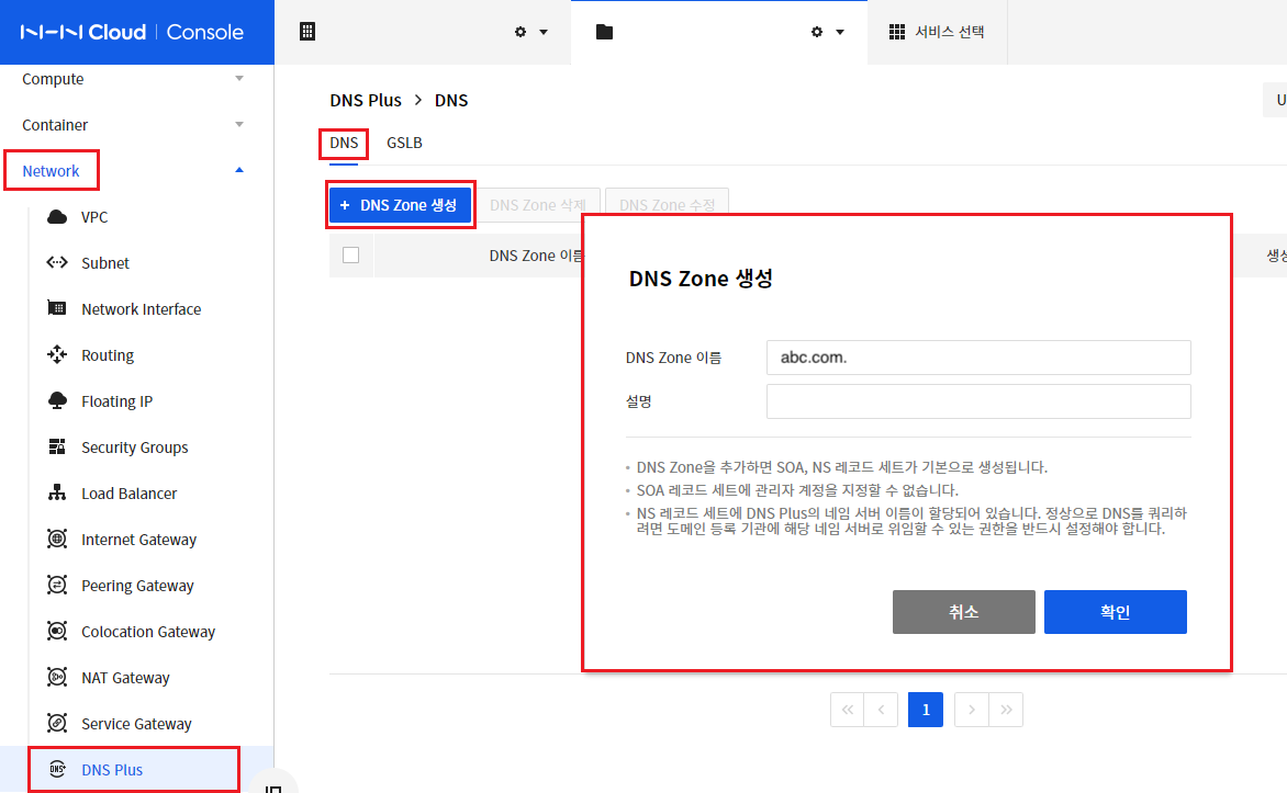 Network >DNS Plus 의 DNS 탭에서 DNS Zone 생성 버튼을 선택하여 연결 된 대화상자에 DNS Zone 이름 및 설명을 입력하여 DNS Zone 생성을 진행한다.