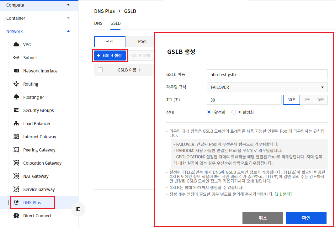 원하는 GSLB 이름을 입력하고 라우팅 규칙 및 TTL, 상태를 설정한다.
