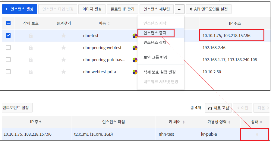 GSLB의 라우팅 규칙인 FailOver 테스트를 위해 한 대의 인스턴스를 중지시킨다.
