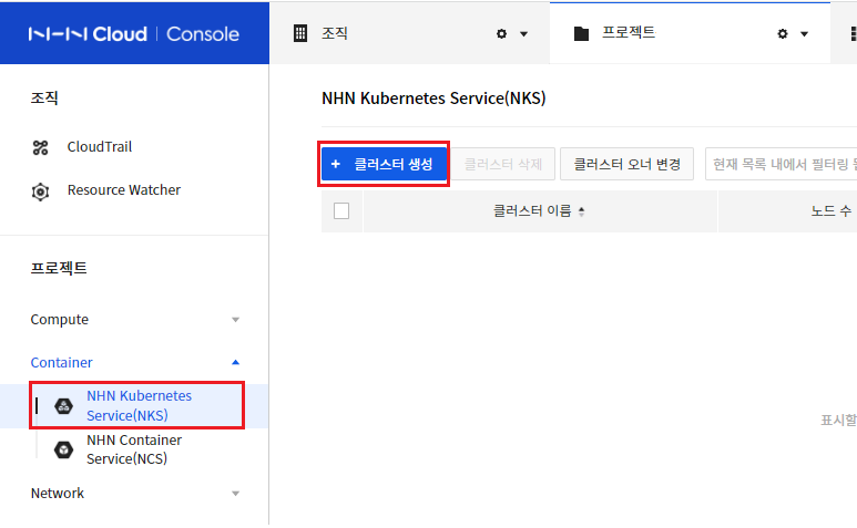 Container > NHN Kubernetes Service (NKS) > +클러스터 생성 버튼을 차례로 선택하여 클러스터 생성 페이지로 접근한다.