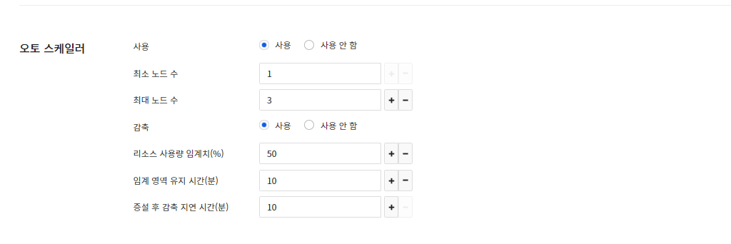 오토 스케일러 기능 사용을 원할 경우 사용을 선택, 오토 스케일러를 통해 자동으로 감축 및 증설 될 최소, 최대 노드 수를 지정하고 오토 스케일러가 동작하기위한 기준을 설정한다.