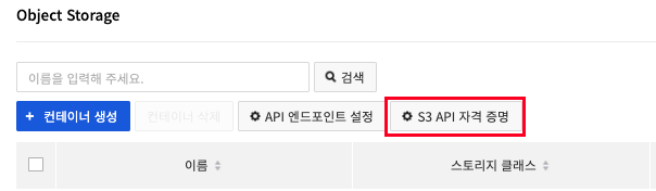 2. Object Storage에서 S3 API 자격 증명 버튼을 클릭합니다.