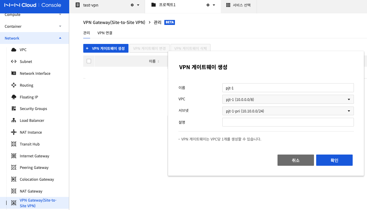 Network > VPN Gateway(Site-to-Site VPN) > 관리 항목에서 VPN 게이트웨이를 생성합니다.
