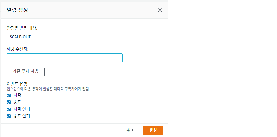 SNS알림은 기존에 설정해 두었던 SCALE-OUT으로 설정합니다.
