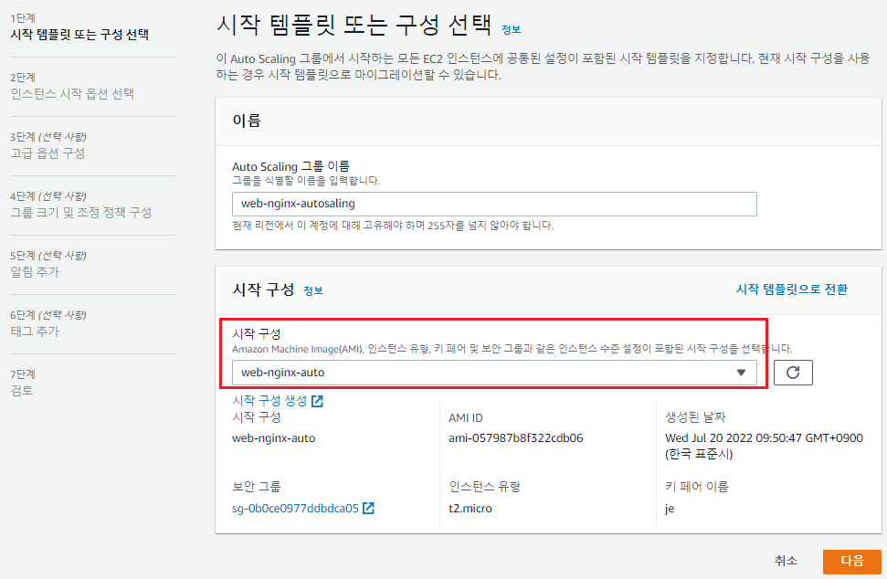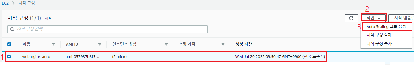 EC2 > Auto Scaling > 시작 구성 > 작업 > Auto Scaling 그룹 생성 메뉴로 이동합니다.