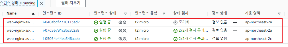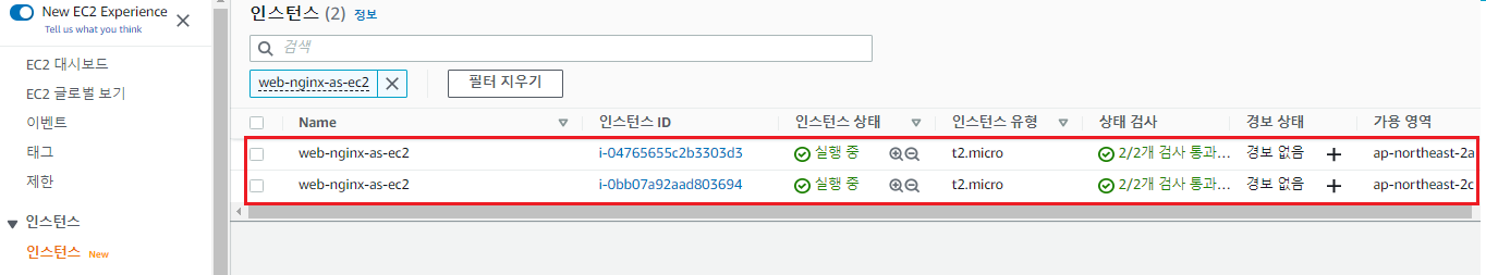 Auto Scaling의 최소 용량 개수인 2개에 맞춰 인스턴스가 자동으로 생성 된 것을 확인할 수 있습니다.