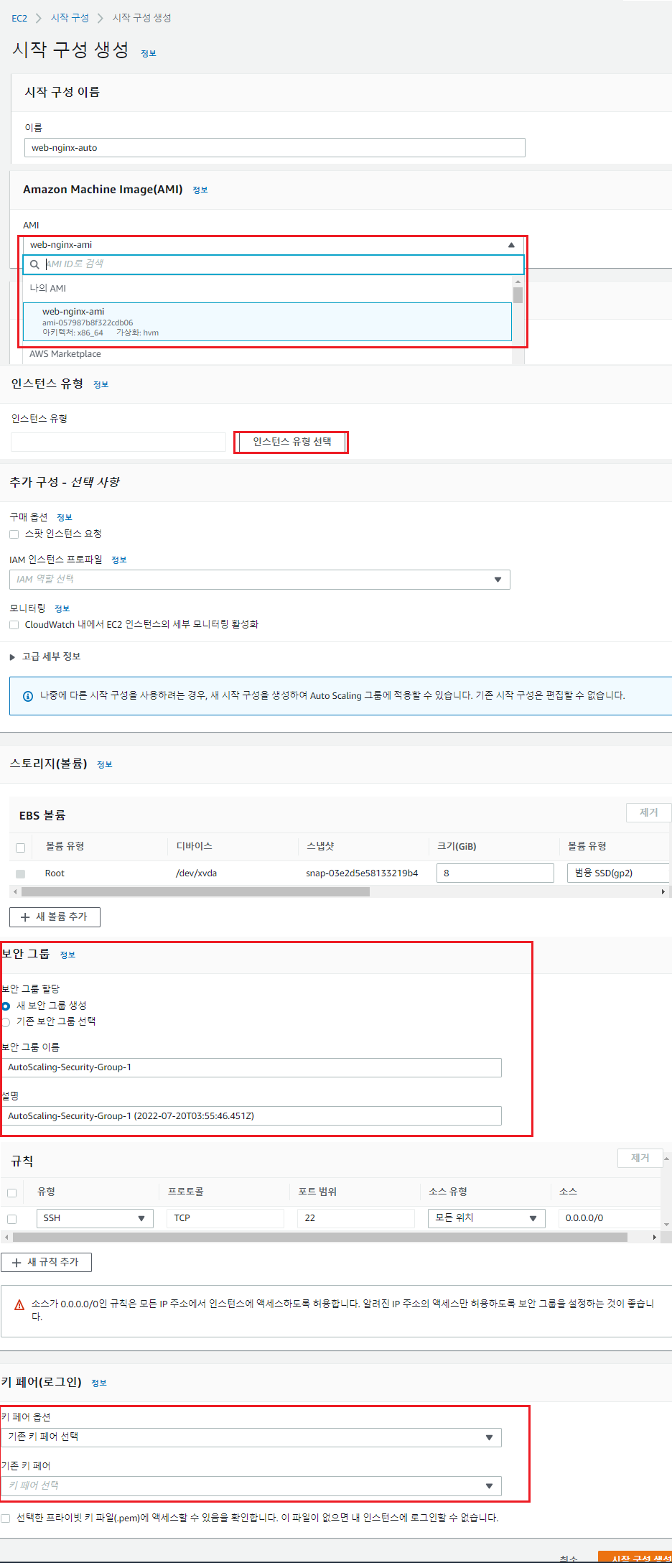 키 페어: Auto Scaling을 통하여 생성 된 EC2에 접속할 키 페어 정보를 선택합니다.