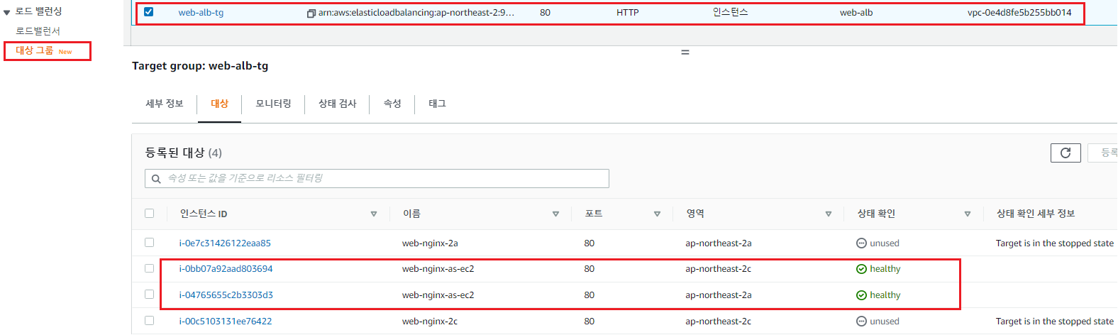 Auto Scaling을 통해 생성 된 EC2 인스턴스들이 자동으로 대상 그룹에 포함되어 있음을 확인합니다.
