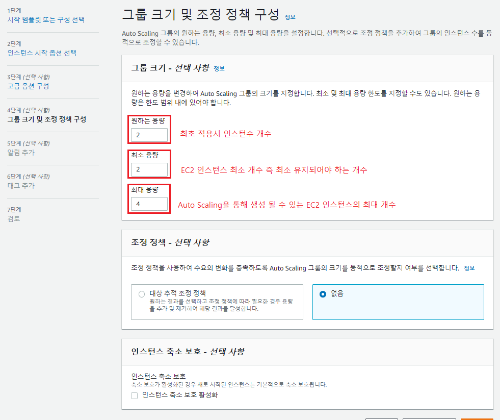 그룹크기: 시작시 인스턴스의 개수, 최소 인스턴스의 개수, 최대 인스턴스의 개수를 지정합니다.