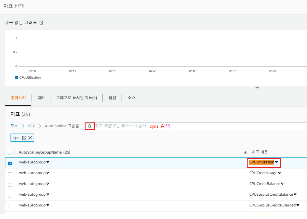 CPU검색 후 Auto Scaling 그룹별 선택, CPUUtiliztion 선택합니다.