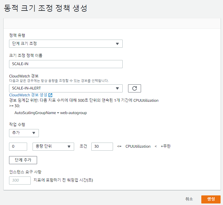아래 캡처 화면을 참고하여 SCALE-IN 알림 생성을 진행합니다.