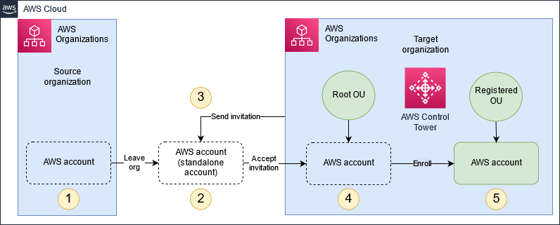 - 초대 및 수락: 대상 조직(Control Tower Org)은 마이그레이션할 계정에게 조직 가입 초대를 보냅니다. 이 초대를 수락하면 해당 계정은 대상 조직의 일원이 됩니다.