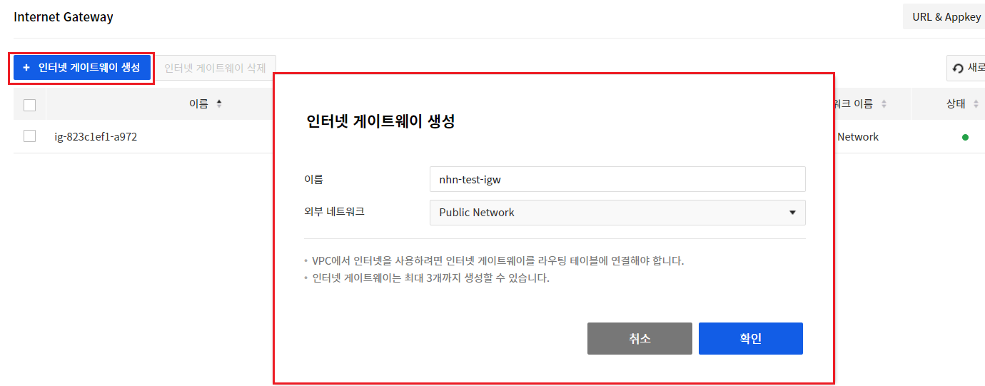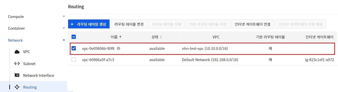 Network > Routing를 차례로 선택, 조회 되는 라우팅 테이블 목록 중 인터넷 게이트 웨이를 연결할 라우팅 테이블 선택, 인터넷 게이트웨이 연결 버튼을 선택하여 인터넷 게이트웨이 연결 대화상자에 연결한다.