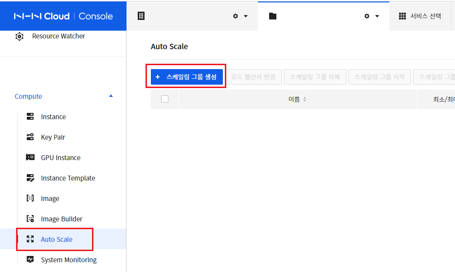 Compute > Auto Scale 을 차례로 선택, 스케일링 그룹 생성 버튼을 선택하여 스케일링 그룹 생성 페이지로 이동한다.