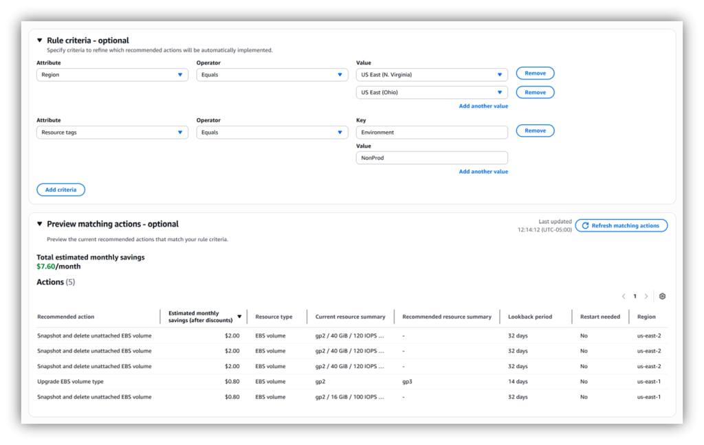 AWS Compute Optimizer에 새로 추가된 Automation Rules 기능을 사용하면, EBS 볼륨에 대한 추천 사항을 주기적으로 자동 적용해서 미사용(Unattached) 볼륨 삭제나 이전 세대 볼륨의 최신 타입 업그레이드를 사람 손을 거치지 않고 처리할 수 있습니다.
